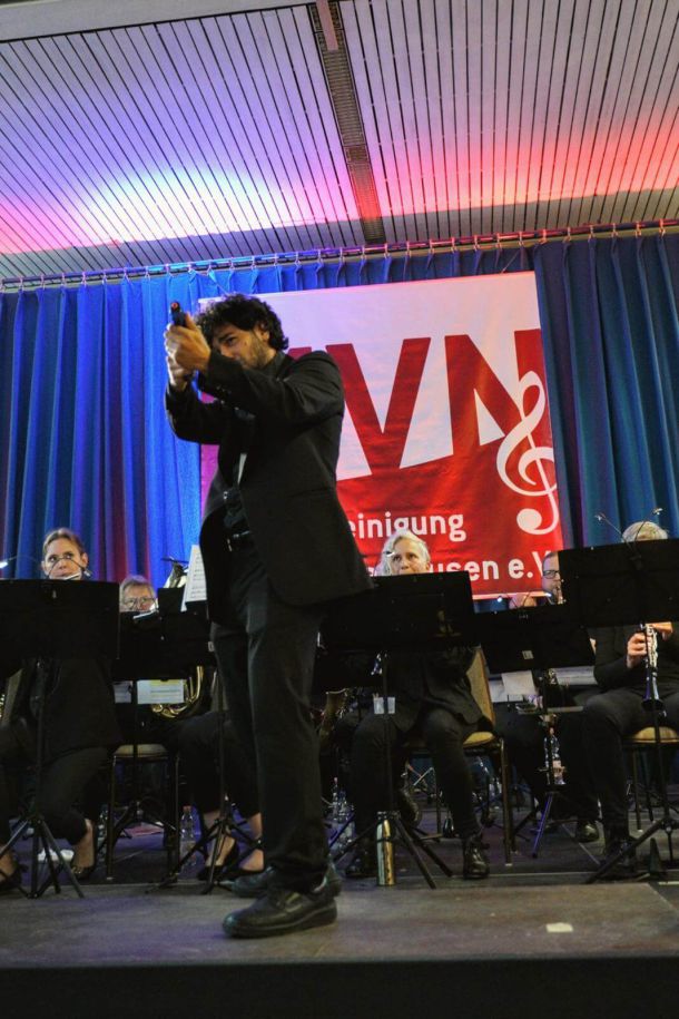 der zu spät kommende Musiker, gespielt von Roland Kettner, erschien derart verspätet, dass das Stück abgebrochen werden musste. Nach einem deutlichen Hinweis unseres Dirigenten Carlos Trujillo wurde Roland vom Konzert ausgeschlossen – und Mission Impossible begann erneut.