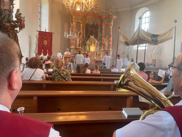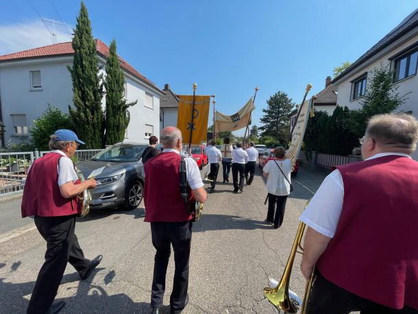 Erstmalig nach 2019 begleitete die Musikvereinigung in diesem Jahr wieder die Ilvesheimer Fronleichnamsprozession musikalisch. Bei herrlichem Sonnenschein ging die Prozession durch die geschmückten Straßen Ilvesheims, bei der an vier mit Blumenteppichen versehenen Stationen Halt gemacht wurde.
