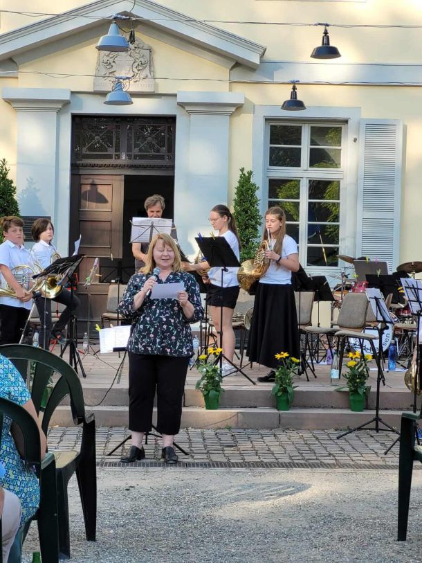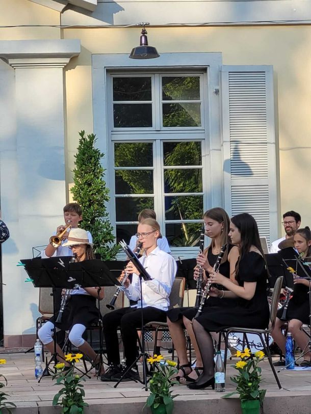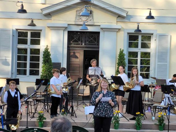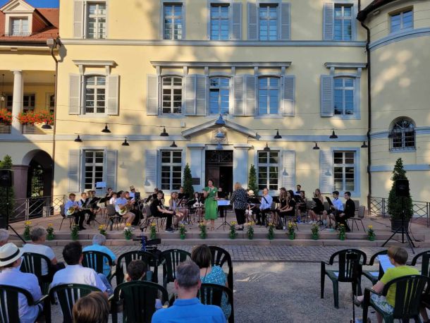Absolut nicht alltäglich war der Auftritt zweier Extra-Ensembles: Der volltönende Hörnerklang des Hornschüler-Ensembles von Laurance Mahady passte perfekt in die Schlosspark-Landschaft und das von Klarinettenlehrer Ralf Schwarz beim Probenwochenende vorbereitete Holzbläser-Ensemble glänzte durch Präzision und Klangschönheit.