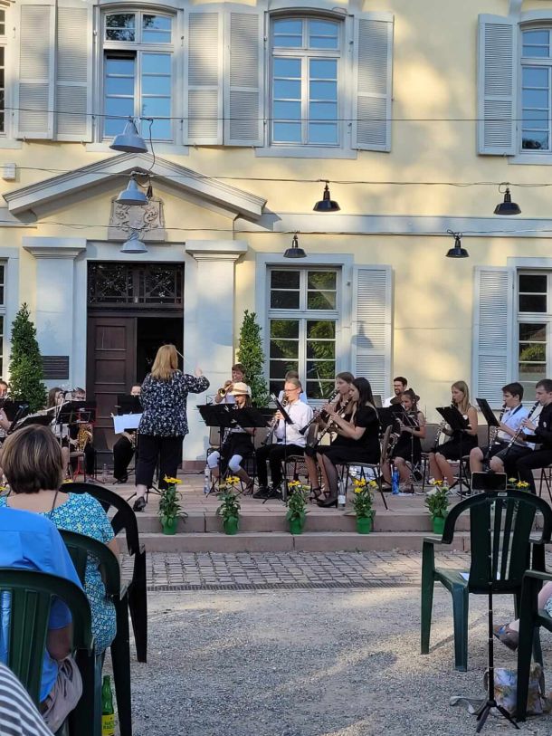 Die Temperaturen waren zwar subtropisch beim ersten Konzert seit Pandemiebeginn, aber der stürmische musikalische Wind, den die jungen Musikerinnen und Musiker des stark verjüngten Jugendblasorchesters Windstärke 08 unter ihrer neuen Dirigentin Laurance Mahady im Schlosshof Neckarhausen entfachten, machte die Hitze vergessen. Gemessen an ihrem Durchschnittsalter von 12 Jahren brachte die junge Truppe eine erstaunliche Leistung.
