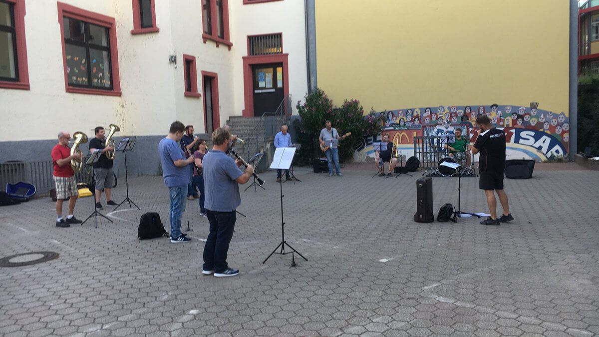 In unserer zweiten Probe am 3.07.2020 waren wir dann schon 13 Musiker, die mit Begeisterung den Schulhof zum Erklingen gebracht hatten, wobei auch einzelne Zuhörer auf dem Neckardamm Beifall spendeten.