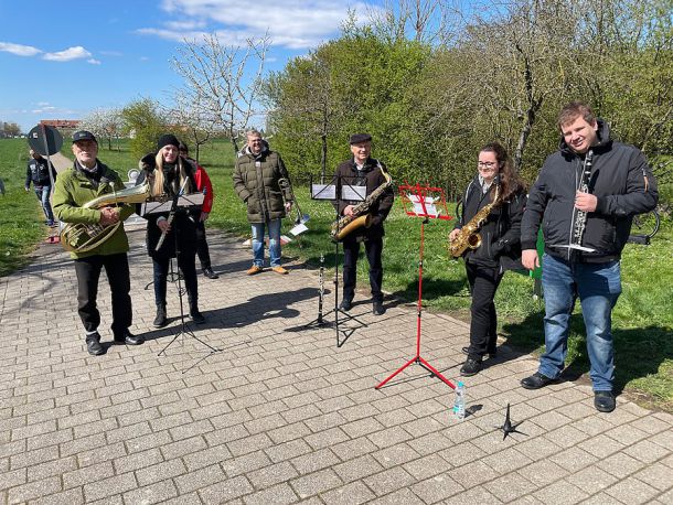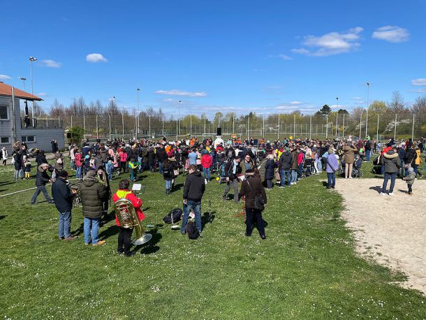 Pünktlich um 14.00 Uhr wurde am Sonntag, den 3. April bei Kaiserwetter der Sommertagszug 2022 gestartet, der erstmalig rund um das Kultur- und Sportzentrum in Edingen stattfand. Sehr gut organisiert durch die Gemeinde waren vier Punkte auf dem Weg rund um das Sportgelände markiert, an denen die Musik spielte.
