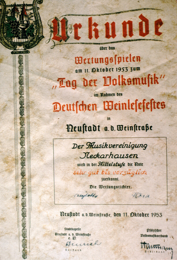 Mit sehr gut bis vorzüglich schneidet die Musikvereinigung beim Wertungsspiel beim "Tag der Volksmusik" im Rahmen des Deutschen Weinlesefestes in Neustadt an der Weinstraße ab.