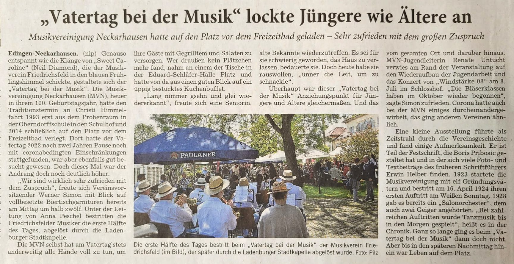 „Damals wie heute sind Freude am Musizieren sowie Treue zum Verein eine der wichtigsten Grundlagen für eine erfolgreiche Vereinsentwicklung“. Das sagte der damalige Bürgermeister Florian König im Juni 1923 zur Gründung. Geändert hat sich an dem Erfolgsrezept kaum. Zum Jubiläum kamen rund 500 Zuhörer, darunter 100 Gäste aus Plouguerneau ins große Festzelt am Neckarhäuser Freizeitbad zusammen, um mit „ihrem“ Musikverein dieses Event zu feiern. Kurze Reden mit den obligatorischen Grußworten von Werner Simon (Erster Vorsitzender), Helmut Spannnagel vom Blasmusiverband Rhein-Neckar und Edingen-Neckarhausens Bürgermeister Florian König, sorgten schon mal zu Beginn für ungeteilte Zustimmung. Und danach kam viel Musik.